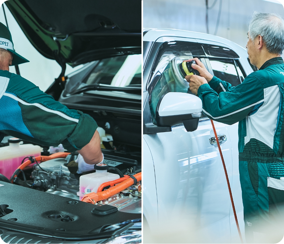 プロのスキルを - 高温スチームや専用洗剤を使って丁寧に車内を洗浄。ボディには必要に応じて磨きを施工しています。清潔で快適な車両を展示し、お客様にご満足いただけるよう努めています。 グループ会社/モビリティサポート株式会社