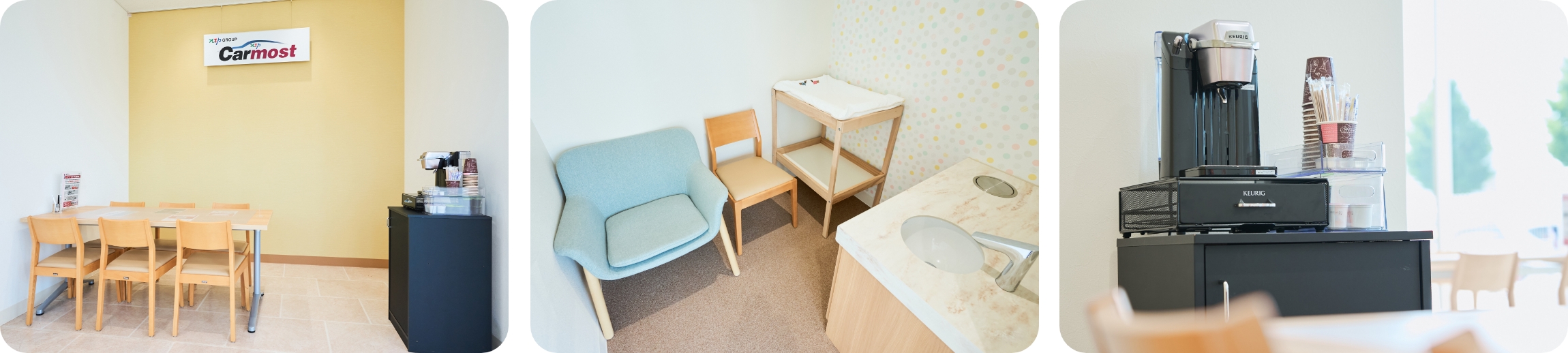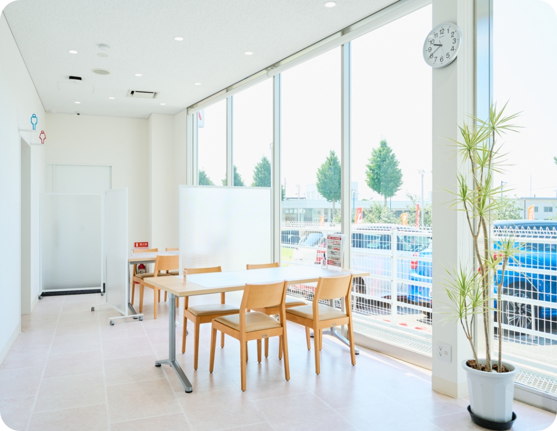 店舗空間づくりを - 白を基調としたガラス張りのショールームは、明るく開放的な雰囲気が特徴です。ベビールームも完備しており、小さなお子様連れのお客様も快適にお過ごしいただけます。